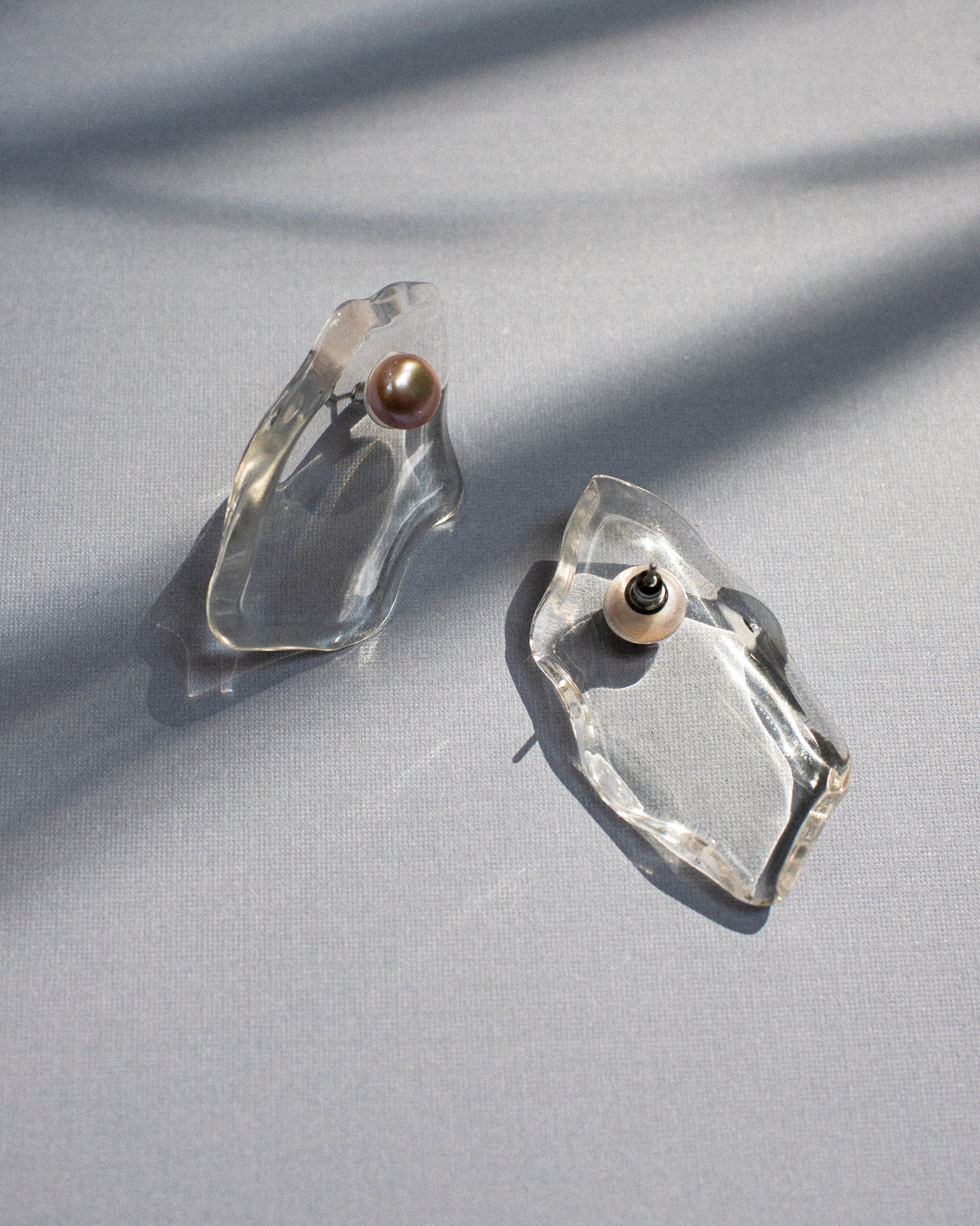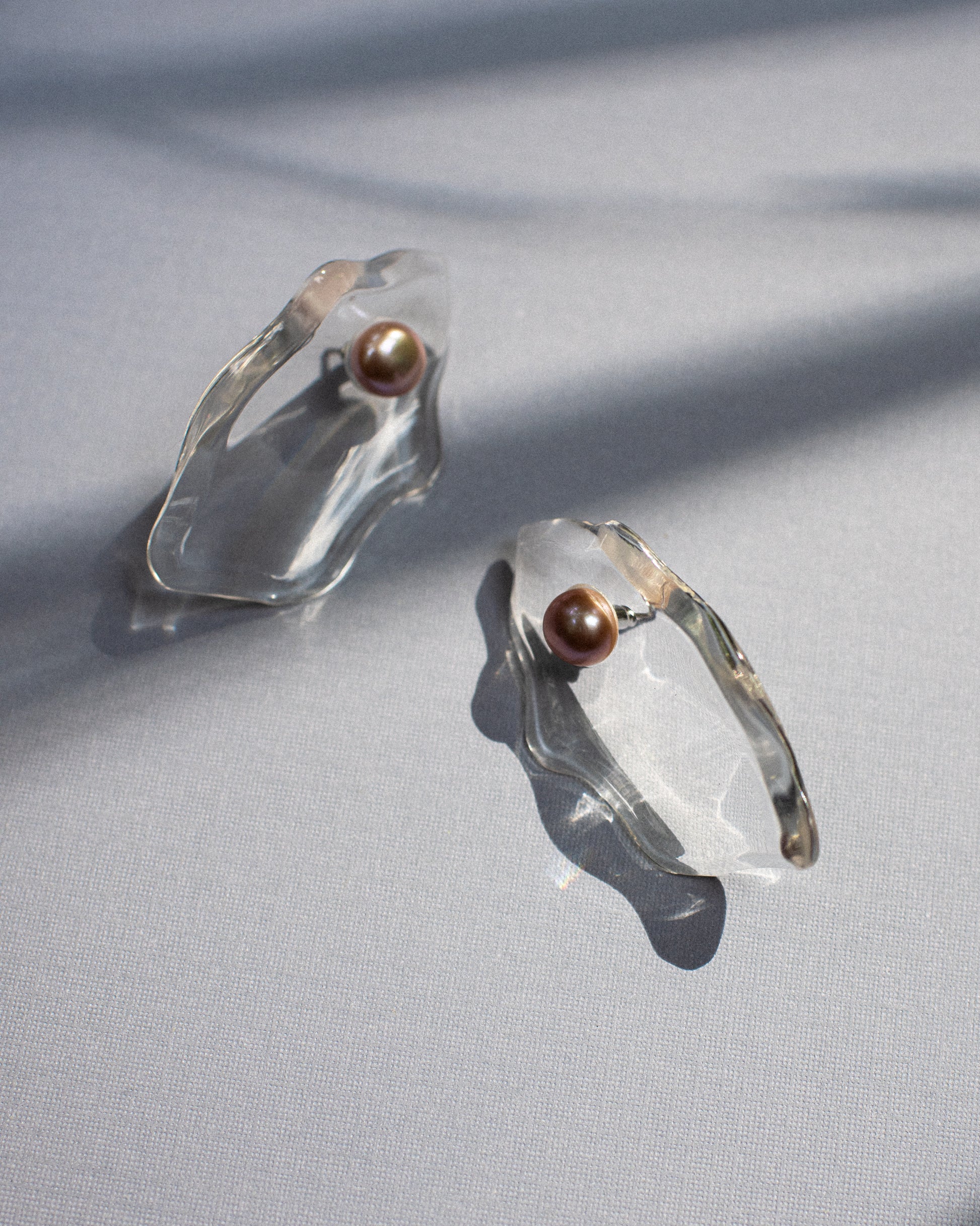 Curved clear abstract shapes being held up by a rose faux pearl stud which is detachable.