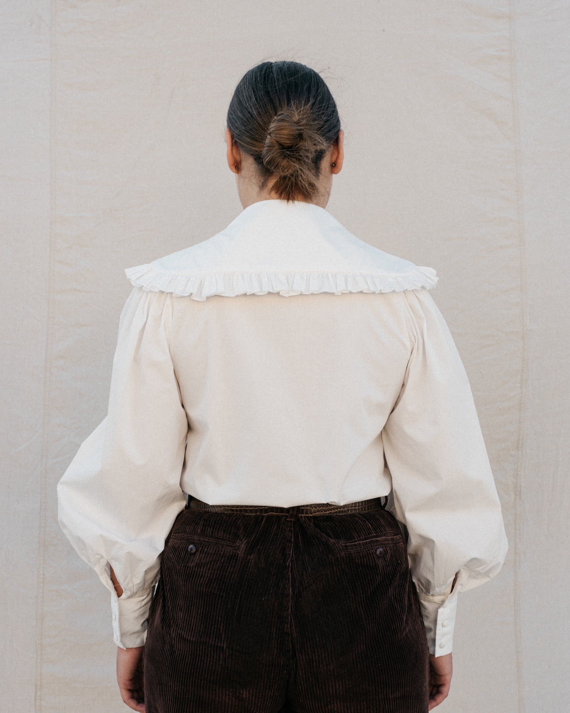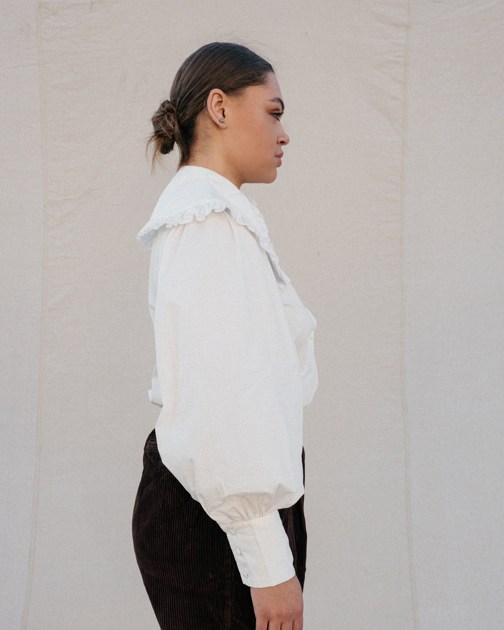 A dash of Victorian. The Theresa blouse in snow white is full-on bold and classic. With a large ruffle Peter Pan collar, matched with puffy bishop sleeves, it’s giving off vintage vibes that are oh so fresh. The Theresa blouse pairs well with the Margaret dress in sand.