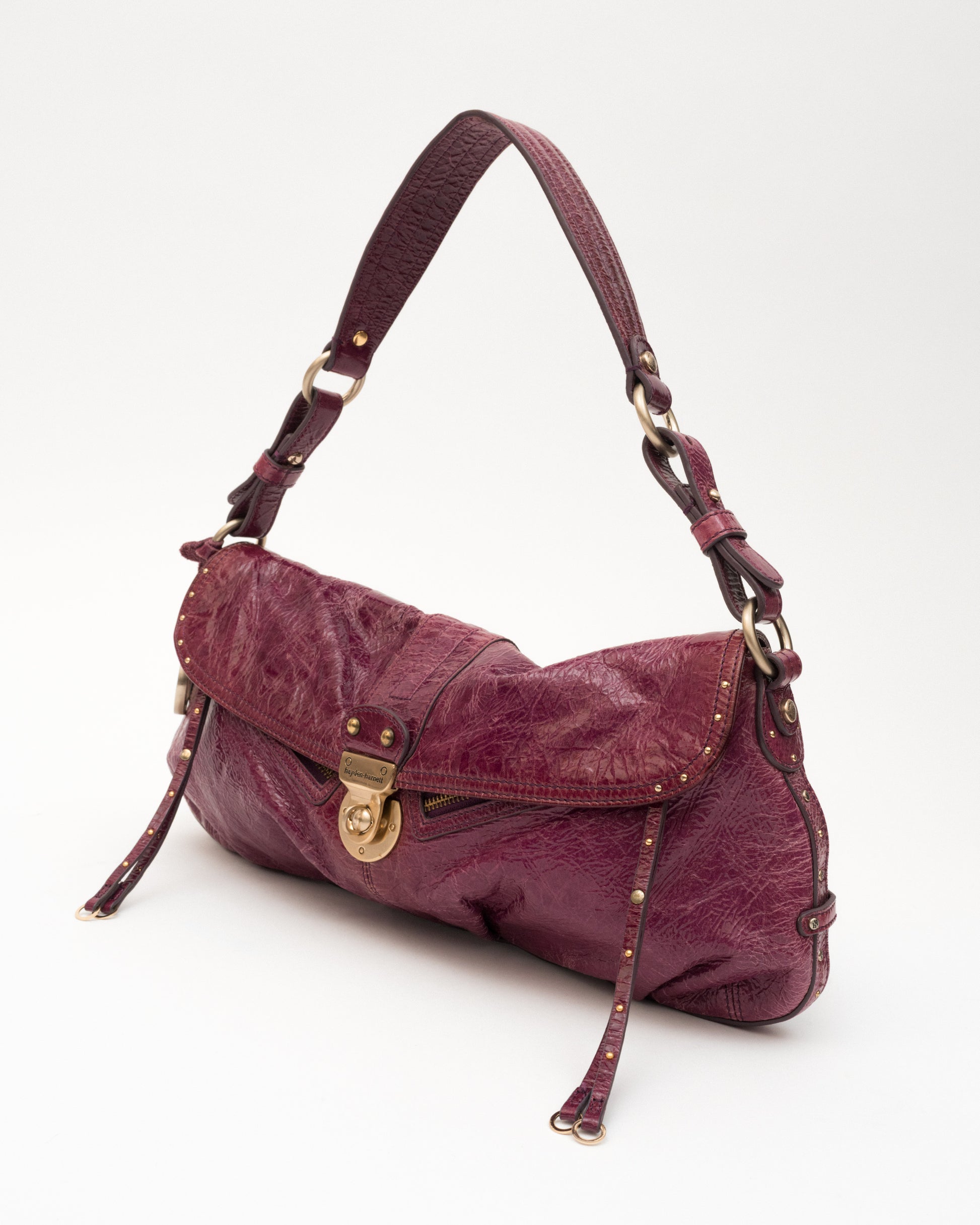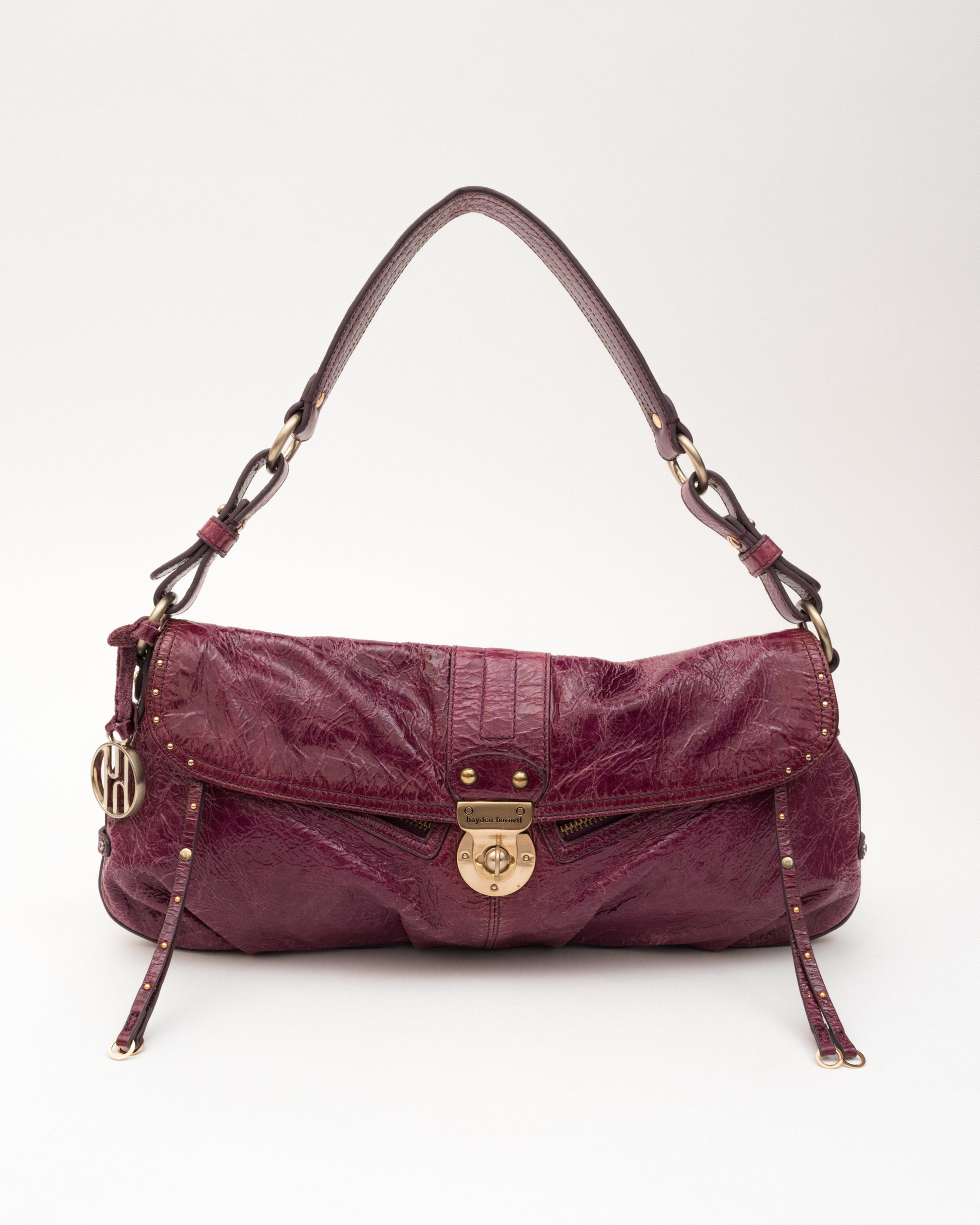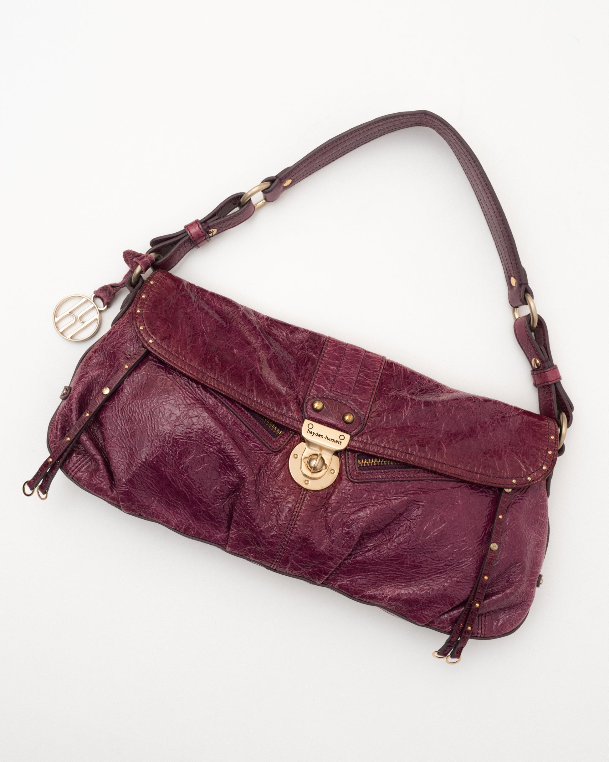 She’s got that rich plum patent and “don’t wait up” energy. Hayden Harnett with gold details, a little crinkle, and a lot of attitude. Feels like trouble... the good kind.