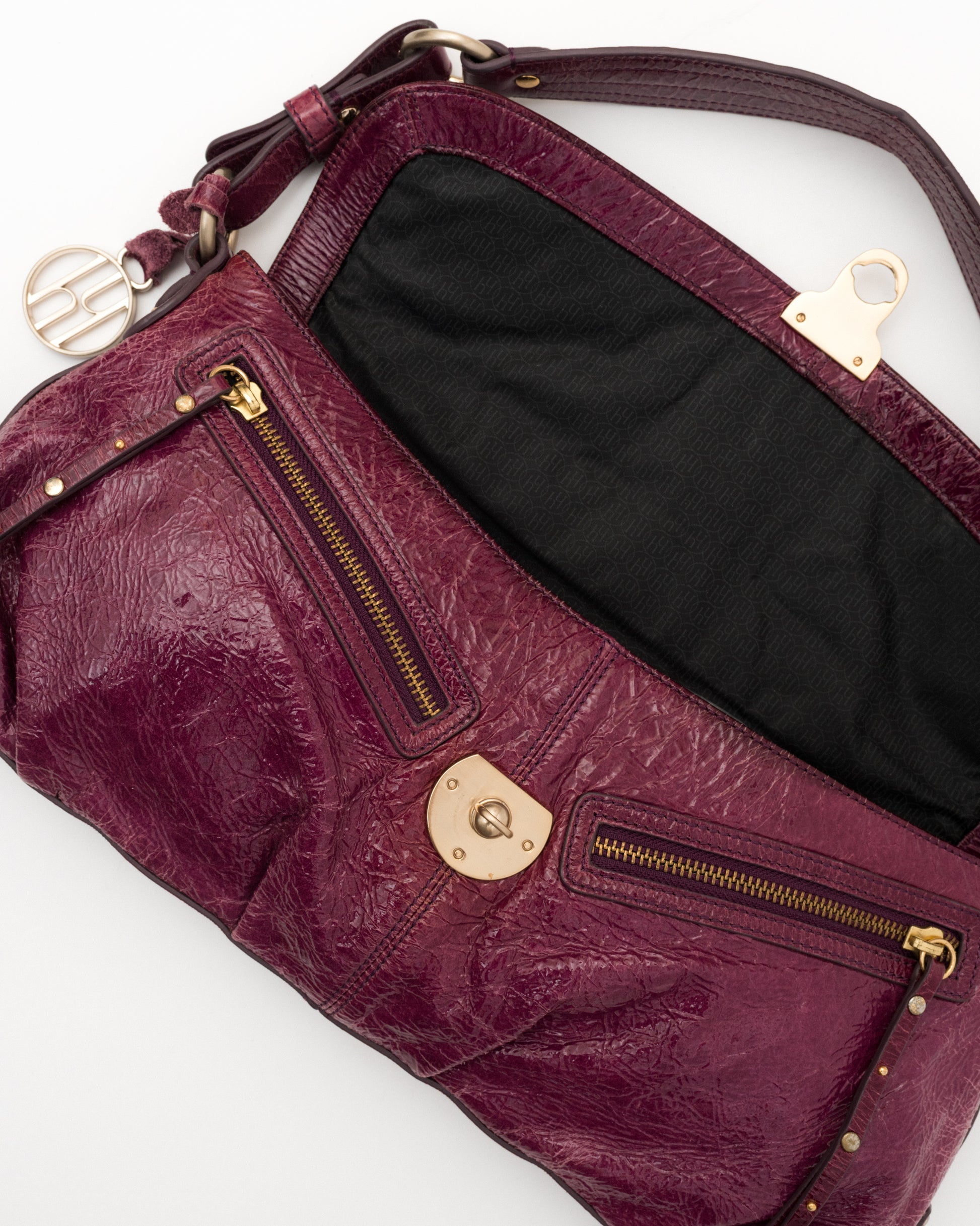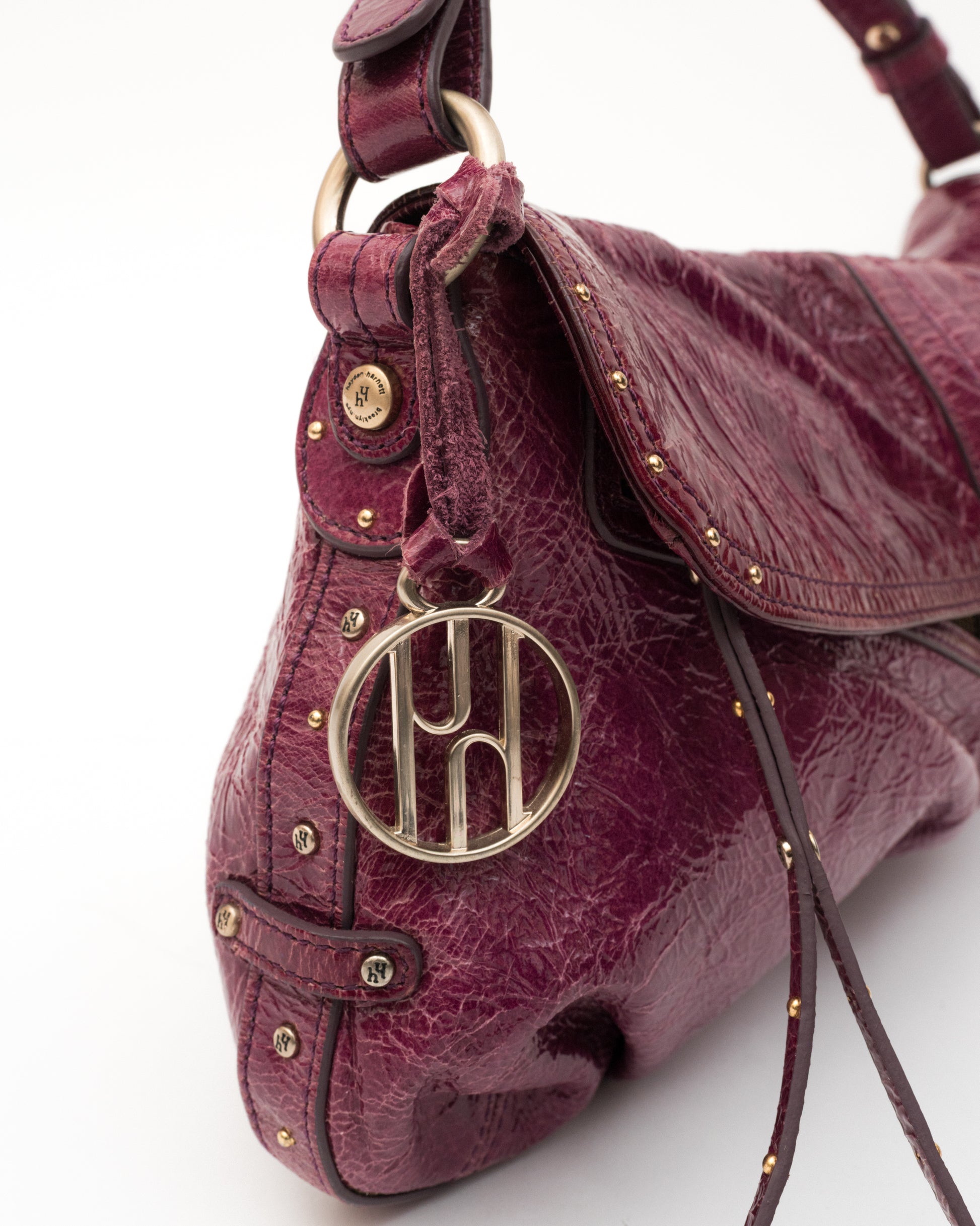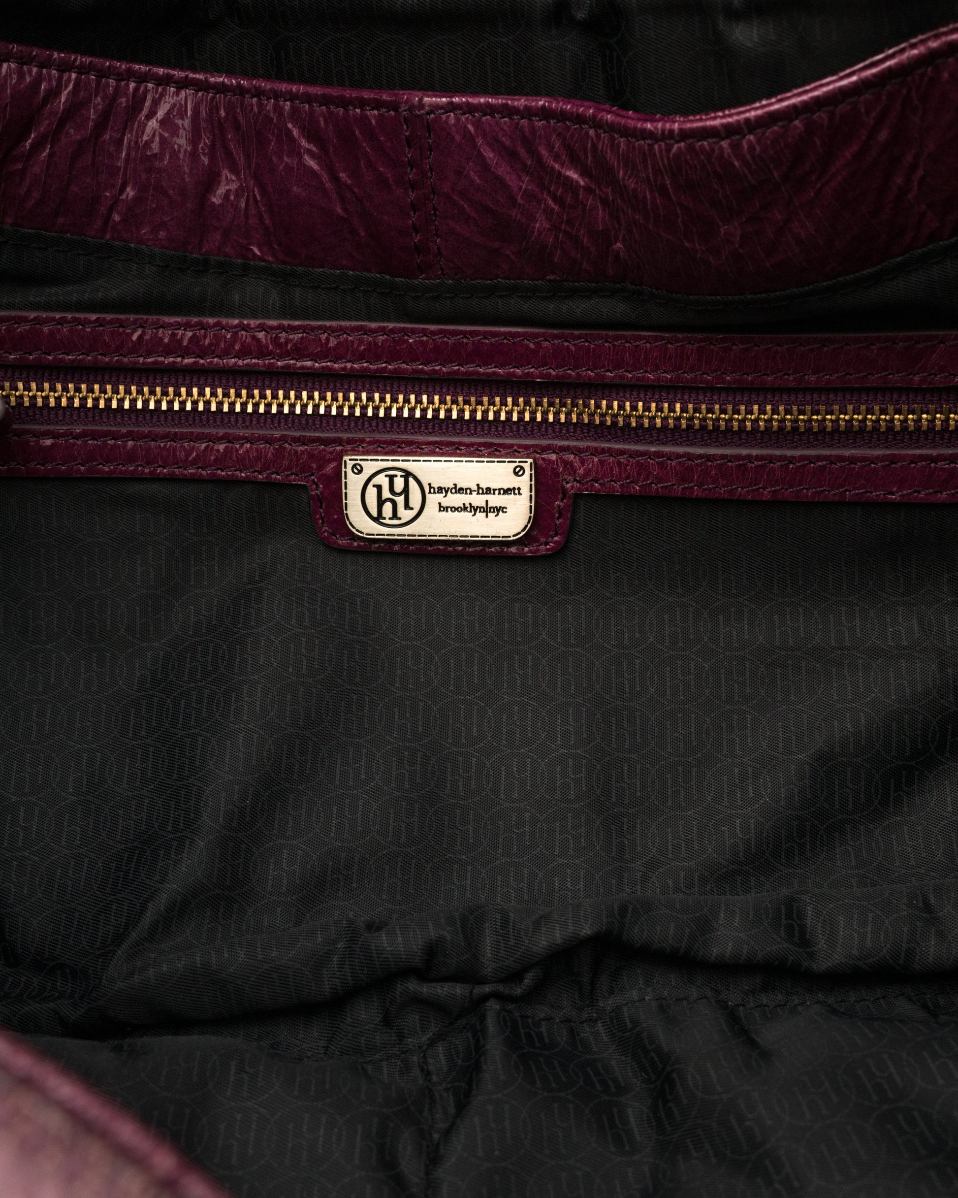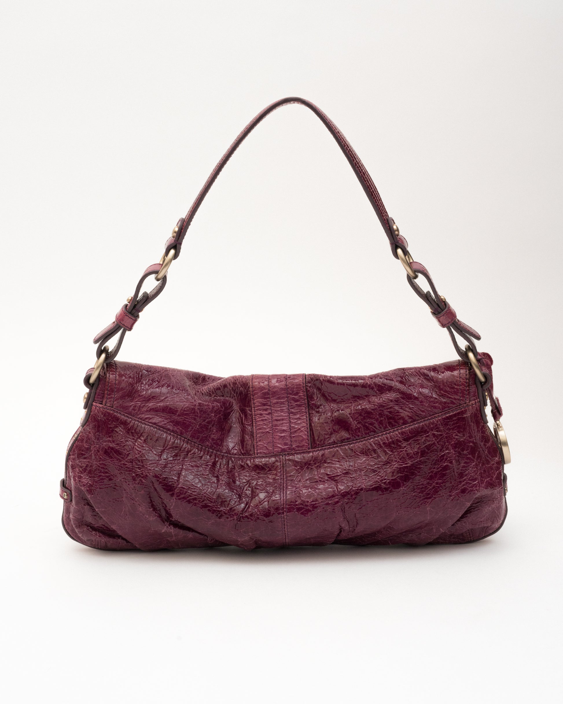She’s got that rich plum patent and “don’t wait up” energy. Hayden Harnett with gold details, a little crinkle, and a lot of attitude. Feels like trouble... the good kind.